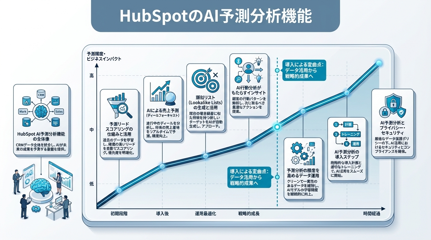 HubSpotのAI予測分析機能は、CRMデータを最大限に活用し、マーケティング・営業の意思決定を科学的に支援する一連の機能群です。本記事の要点を整理します。