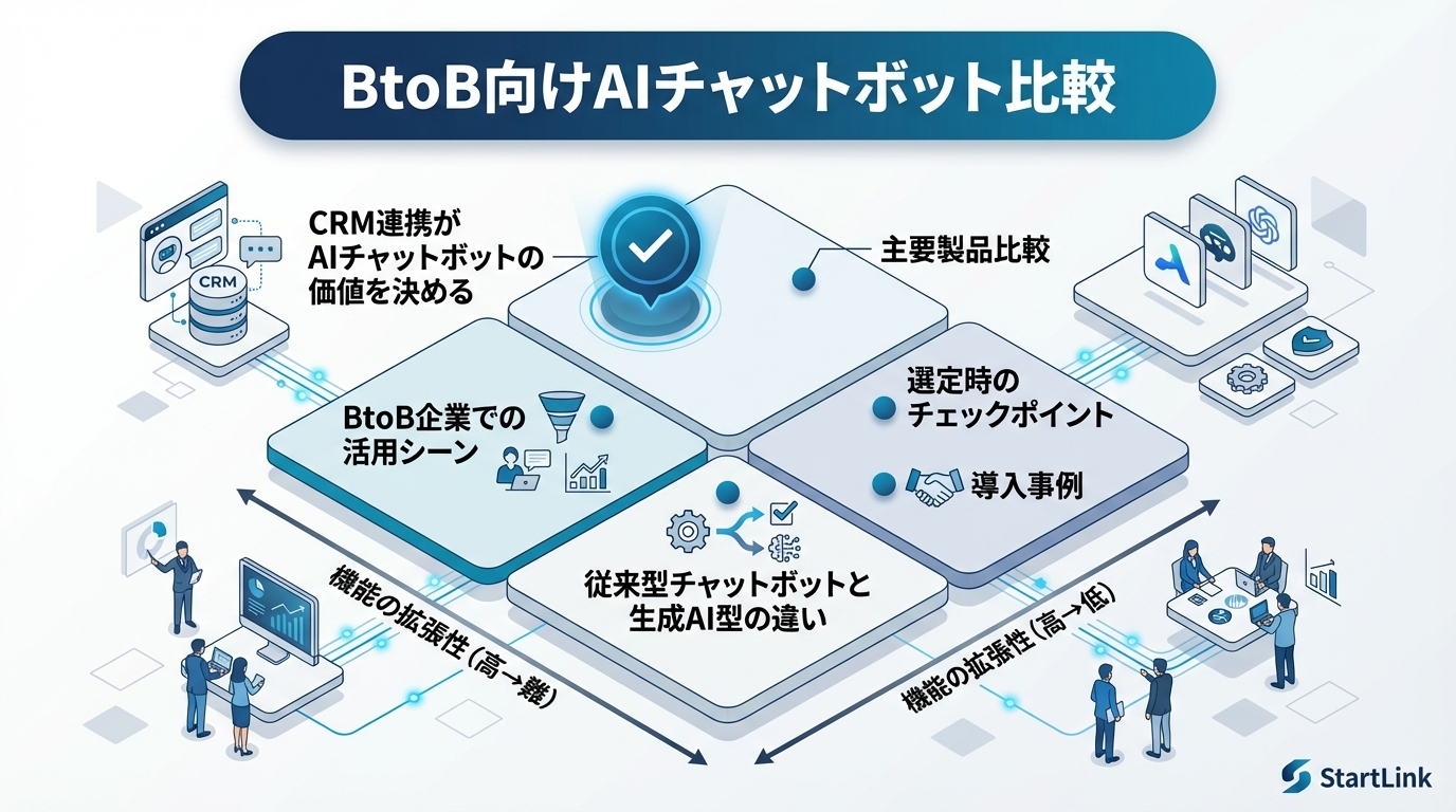 metaDescription: "BtoB向けAIチャットボットの主要製品を比較。従来型との違い、導入効果、CRM連携の重要性、選定時のチェックポイントを解説します。"