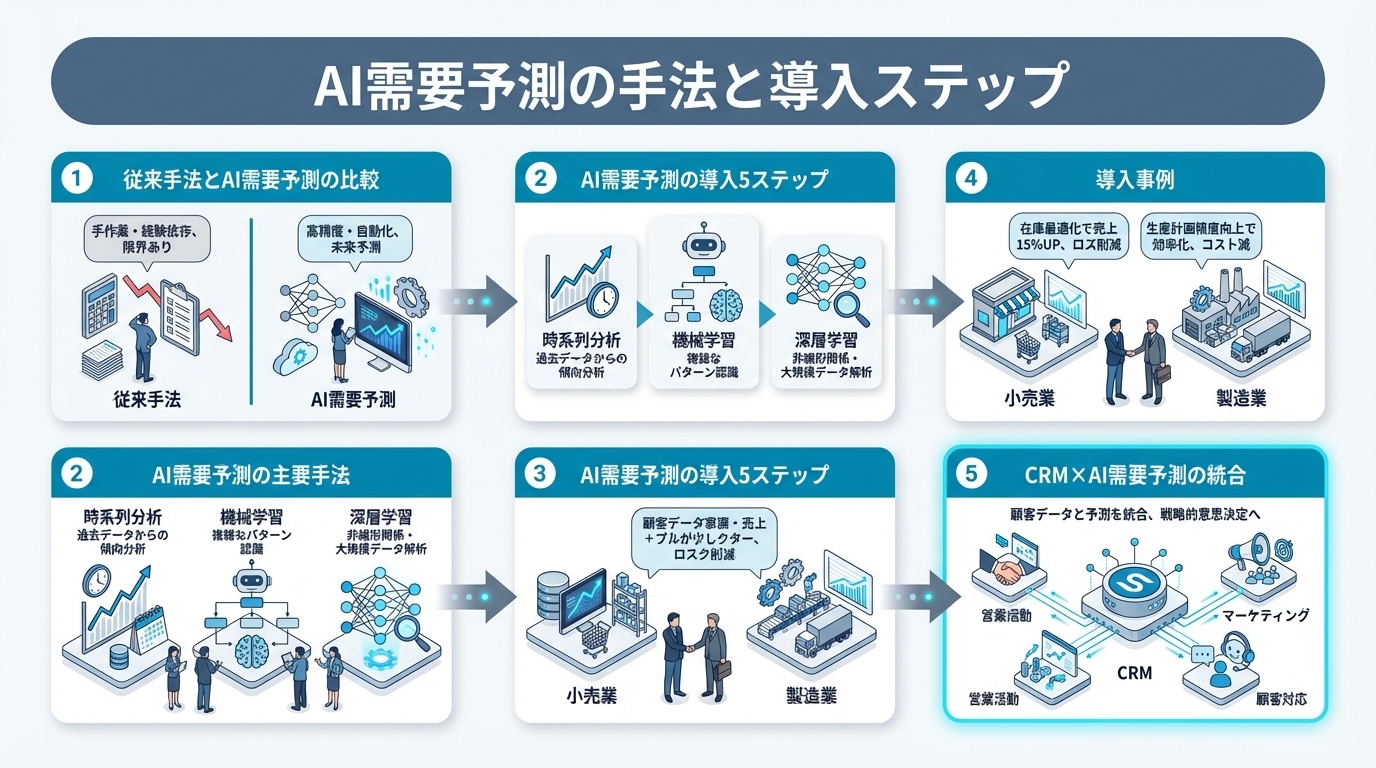 metaDescription: "AI需要予測の主要手法と導入ステップを解説。従来の統計手法との違い、精度を高めるデータ準備のポイント、BtoB企業での活用事例を紹介します。"