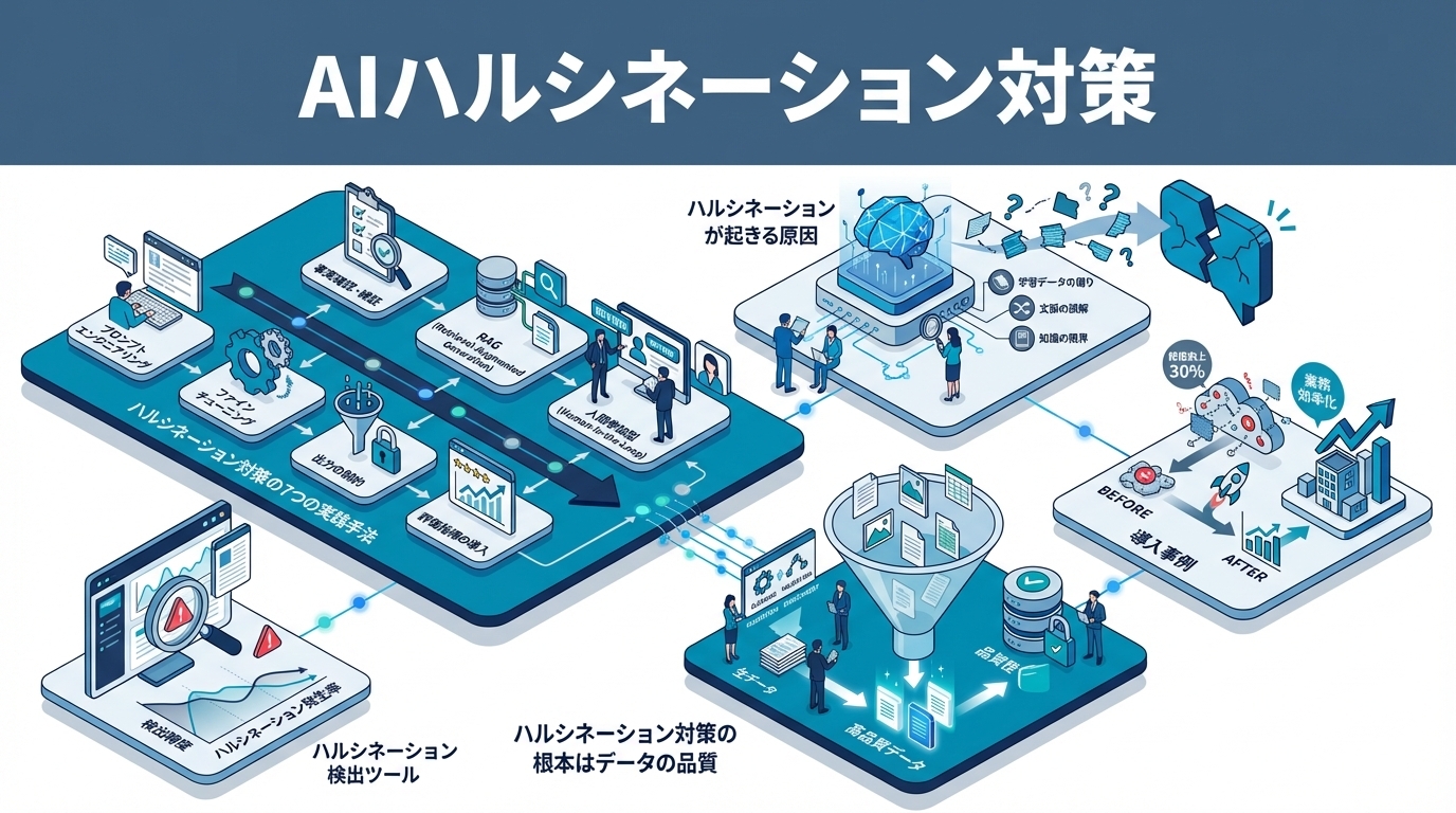 metaDescription: "生成AIのハルシネーション(幻覚・誤情報生成)の原因と対策を解説。RAG、ファクトチェック、プロンプト設計など、企業が実践できる具体的な防止策を紹介します。"