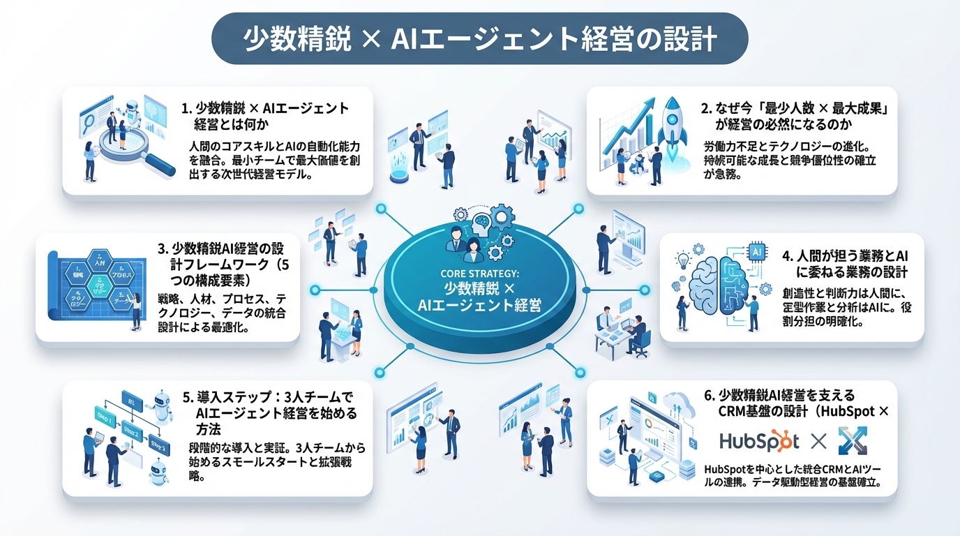 metaDescription: 少数精鋭×AIエージェント経営の設計方法を解説。3人チーム+AIエージェント5体で10人分の成果を出す具体的な組織設計フレームワーク、業務マッピング、CRM基盤の構築手順を紹介します。