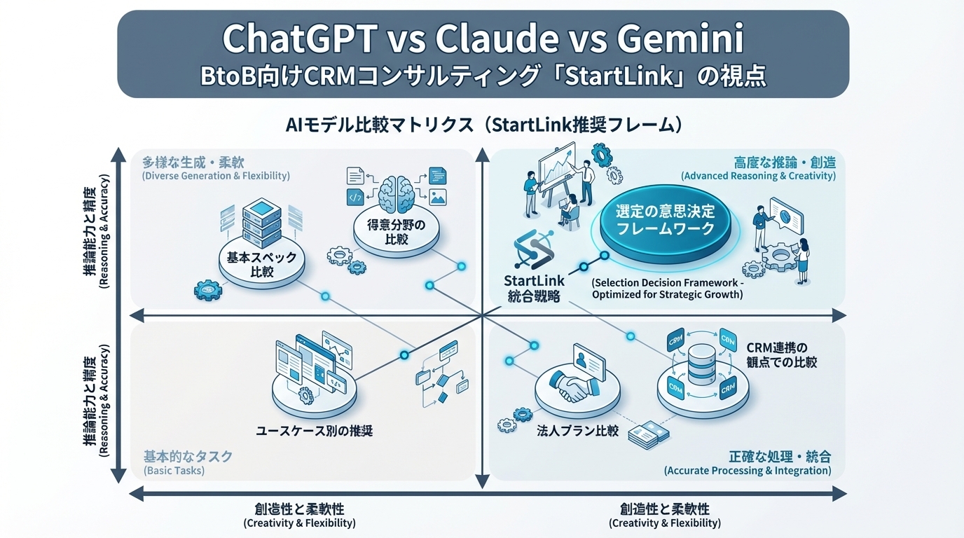 実務的には、単一のAIに固定するのではなく、ユースケースに応じて複数のAIを使い分ける「マルチAI戦略」を採用する企業が増えています。CRMをデータのハブとして位置づけ、タスクに応じて最適なAIを接続する設計が、2025年以降の主流になりつつあります。