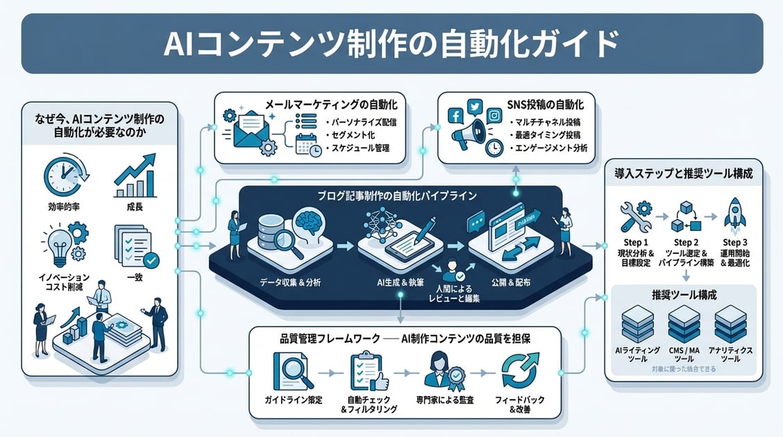 重要なポイントは、AIを「人間のライターの代替」としてではなく、「コンテンツ制作パイプライン全体を自動化するエンジン」として捉えることです。記事を1本書くだけでなく、キーワードリサーチ・構成設計・執筆・校正・画像生成・公開・効果測定までの全工程をAIで効率化する――これが2026年のコンテンツ制作の新しいスタンダードです。