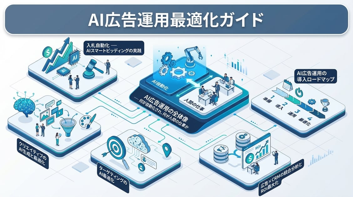 入札自動化は、AI広告運用で最も導入効果が出やすい領域です。Google広告のスマートビッディング、Meta広告の自動入札を中心に解説します。