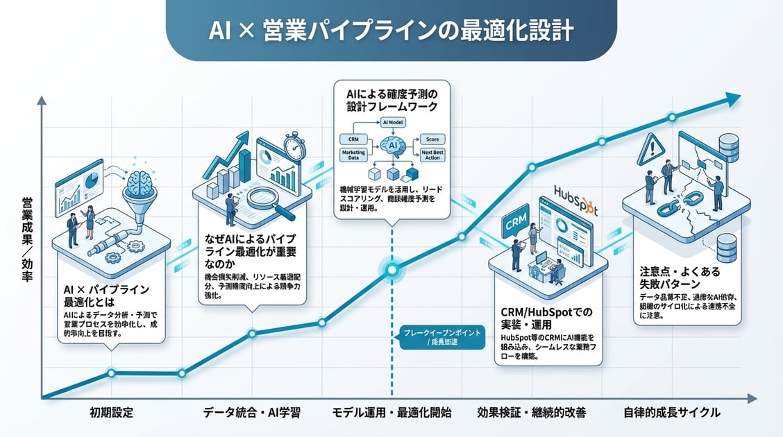 AI × 営業パイプラインの最適化設計を実務に落とし込むには、CRMツールの活用が不可欠です。詳しくは「HubSpotのAI予測分析機能|予測リードスコアリング・売上予測・類似リスト生成」で解説しています。