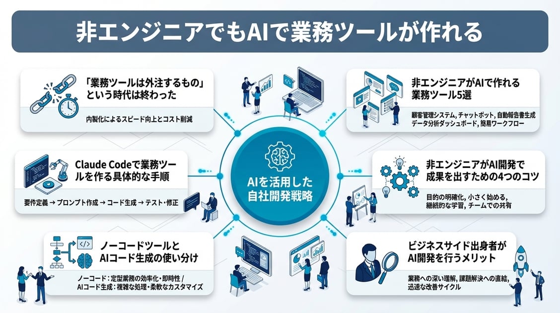 非エンジニアがAIで業務ツールを自作する時代は、すでに到来しています。Claude Codeをはじめとするai開発ツールは、プログラミングの知識を持たないビジネスパーソンでも、自然言語の指示だけで実用的な業務ツールを作ることを可能にしました。