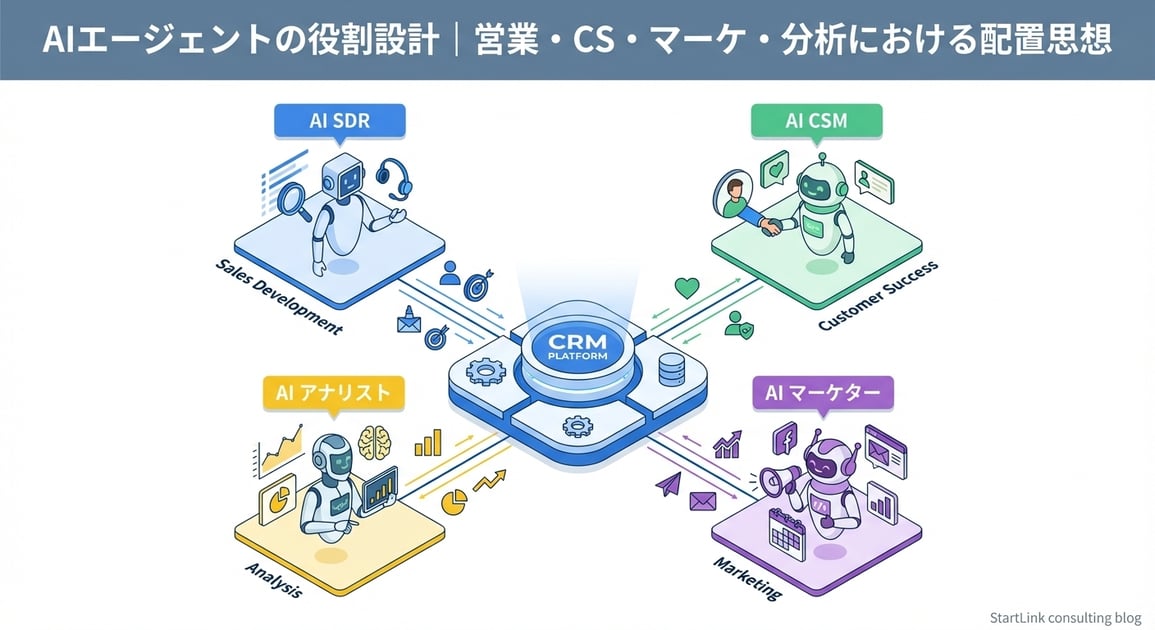 AIエージェントの役割設計を実務に落とし込むには、CRMツールの活用が不可欠です。詳しくは「AI CRMとは?2026年のCRM × AI活用トレンドと実践的な導入ステップ」で解説しています。
