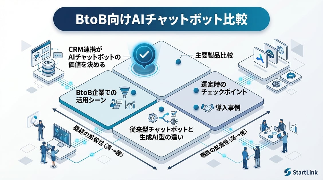 BtoB向けAIチャットボット比較を実務に落とし込むには、CRMツールの活用が不可欠です。詳しくは「AI CRMとは?2026年のCRM × AI活用トレンドと実践的な導入ステップ」で解説しています。