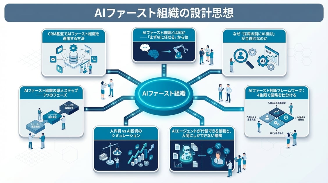 CRMを基盤としたAIファースト組織の詳しい設計については、「エージェンティック経営の設計図|「人+AI」で動く新しい組織の設計思想」で解説しています。