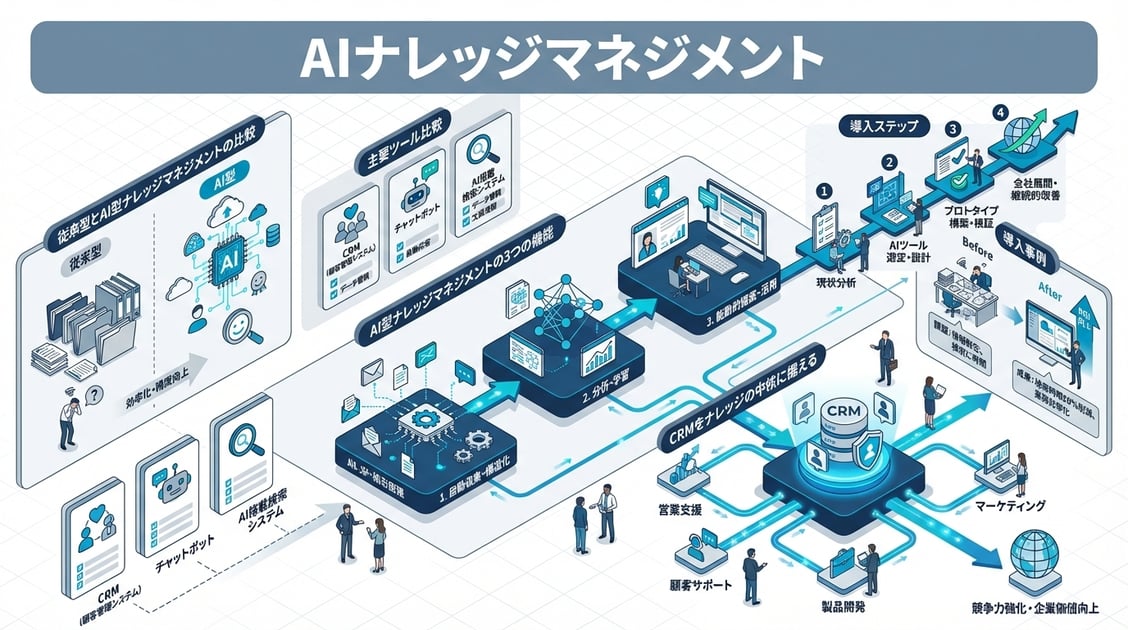 CRMは企業のナレッジの中核を担う存在です。顧客との全てのインタラクション(メール、電話、商談、サポートチケット)がCRMに記録されており、これは組織のナレッジそのものです。CRMのデータをAIナレッジ基盤に統合することで、「この顧客との過去のやり取り」「類似業界の成功事例」「よくある質問と対応」を瞬時に検索・活用できる環境が構築できます。