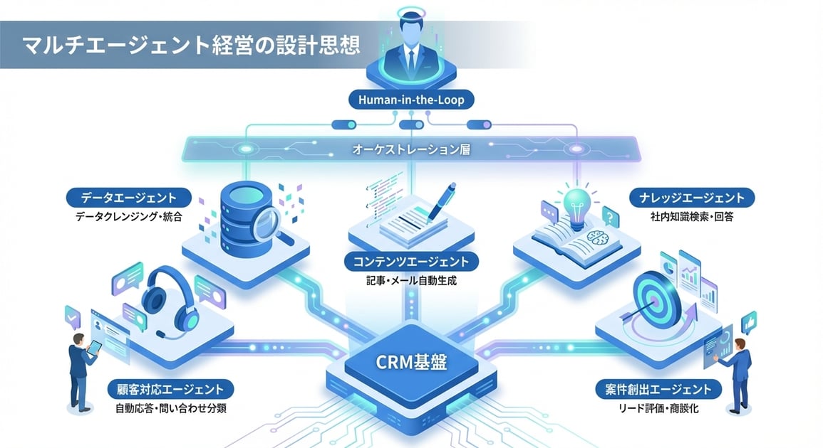 - マルチエージェント経営とは: 複数の専門AIエージェントをCRM基盤の上で連携させ、組織全体として最適な行動を取る経営設計思想