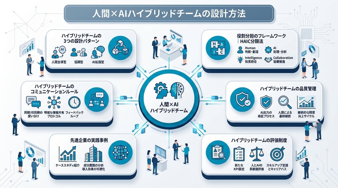 しかし「AIをチームに加える」と言っても、具体的にどう設計すればよいのかは多くの企業にとって未知の領域です。本記事では、人間とAIが効果的に協働するチーム体制の設計方法を、役割分担から評価ルールまで実践的に解説します。