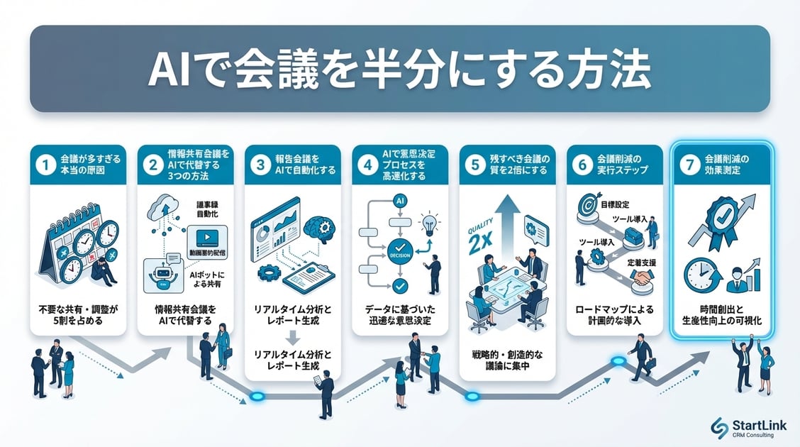 会議時間を半分に削減するためには、まず会議を「情報共有型」「合意形成型」「創造型」の3類型に分類し、全体の約50%を占める情報共有型の会議をAIで代替することが出発点となります。AIダッシュボードによるリアルタイム共有、AI自動レポートの定期配信、AI要約による非同期ブリーフィングの3つの方法を活用すれば、情報共有のための会議は不要になります。