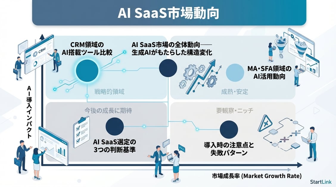 AI SaaS市場は2025〜2026年にかけて急成長しており、CRM・MA・SFA領域では主要ベンダーがこぞってAI機能をプラットフォームに組み込んでいます。HubSpotのBreeze、SalesforceのEinstein GPT、MicrosoftのCopilot for Dynamicsなど、生成AI搭載のSaaSが業務の在り方を変えつつあります。選定基準は「AI機能の実用度」「既存システムとの統合性」「コストに対する効果の明確さ」の3点に集約されます。