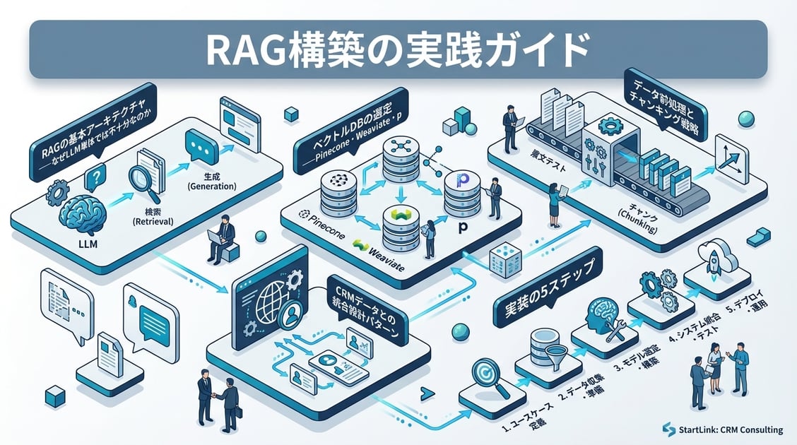 本記事では、RAGの基本アーキテクチャから、実装の具体的なステップ、CRMデータとの連携パターンまでを実務視点で解説します。