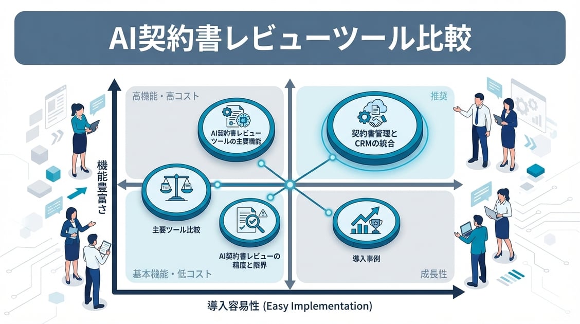 AI契約書レビューツールは、契約書のリスク条項を自動検出し、修正提案を生成することで、レビュー時間を大幅に短縮します。本記事では、主要なAI契約書レビューツールを比較し、導入のポイントを解説します。