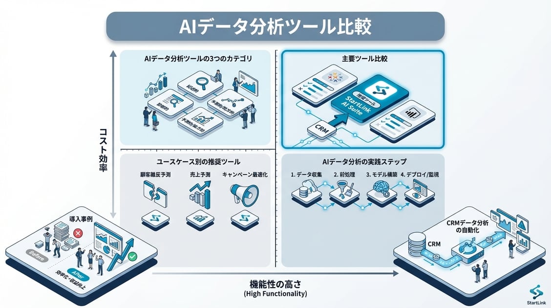 AIデータ分析ツールは、SQLやPythonの知識がなくても自然言語で質問するだけでデータの集計・可視化・予測分析を実行できるツールです。自然言語BI(ThoughtSpot・Power BI)・AI分析プラットフォーム(DataRobot)・LLMベース分析(ChatGPT・Julius AI)の3カテゴリがあり、CRMデータ分析にはHubSpotレポート/Tableau、アドホック分析にはChatGPT/Julius AIが最適です。メルカリはThoughtSpot導入でデータチームのボトルネックを解消しています。