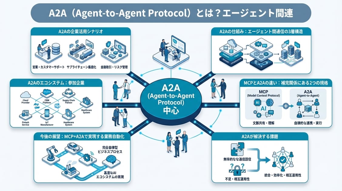 A2A(Agent-to-Agent Protocol)とは、Googleが2025年4月に発表した、異なるベンダーのAIエージェント同士が安全に情報交換・タスク委任を行うための標準規格です。MCPが「AIとツールの接続」を担うのに対し、A2Aは「AIとAIの接続」を担い、両プロトコルの組み合わせでマルチエージェントシステムが実現します。Salesforce・SAP・Atlassianなど主要企業が策定に参加しており、エンタープライズ環境でのAIエージェント連携が加速しています。