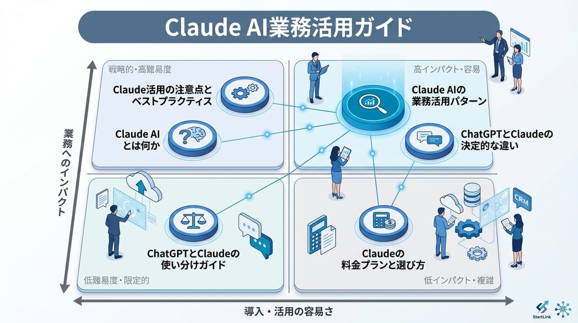Claude AIは長文処理能力・指示遵守性・安全性の3点でChatGPTと明確に差別化されており、大量ドキュメントの分析、正確なフォーマット出力、コード生成においてBtoB業務で特に力を発揮します。ChatGPTとClaudeを適材適所で使い分けることが、生成AI活用の効果を最大化する鍵です。