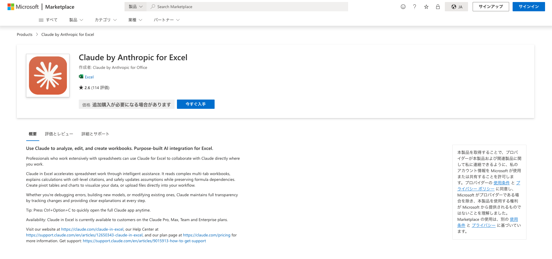 - Microsoft Marketplaceにアクセス — 「Claude by Anthropic for Excel」を検索し「Get it now」をクリック