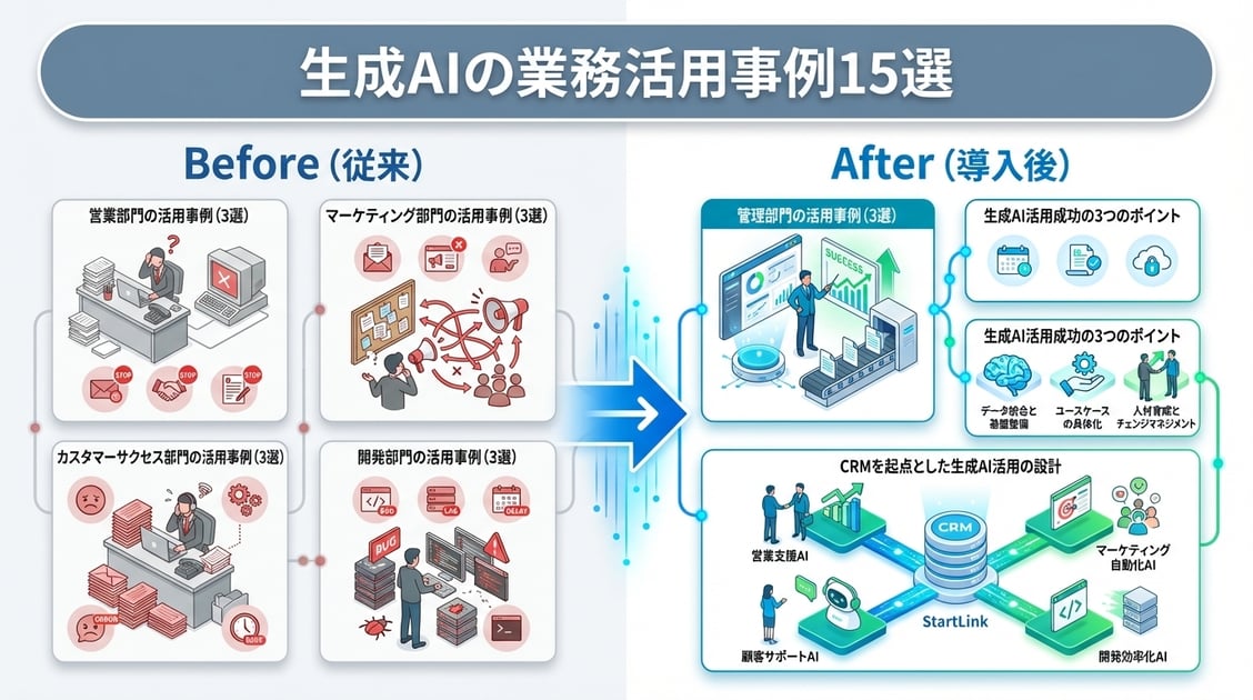 本記事では、営業・マーケティング・カスタマーサクセス・開発・管理部門の5領域にわたる15の生成AI活用事例を、導入企業の具体的な取り組みとともに紹介します。