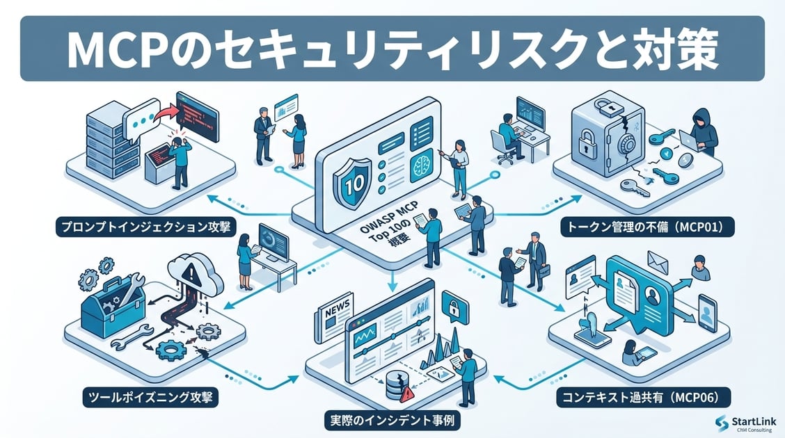 本記事では、MCPのセキュリティリスクについて、OWASP MCP Top 10に基づきプロンプトインジェクション・ツールポイズニング・トークン漏洩などの脅威と対策を解説しました。
