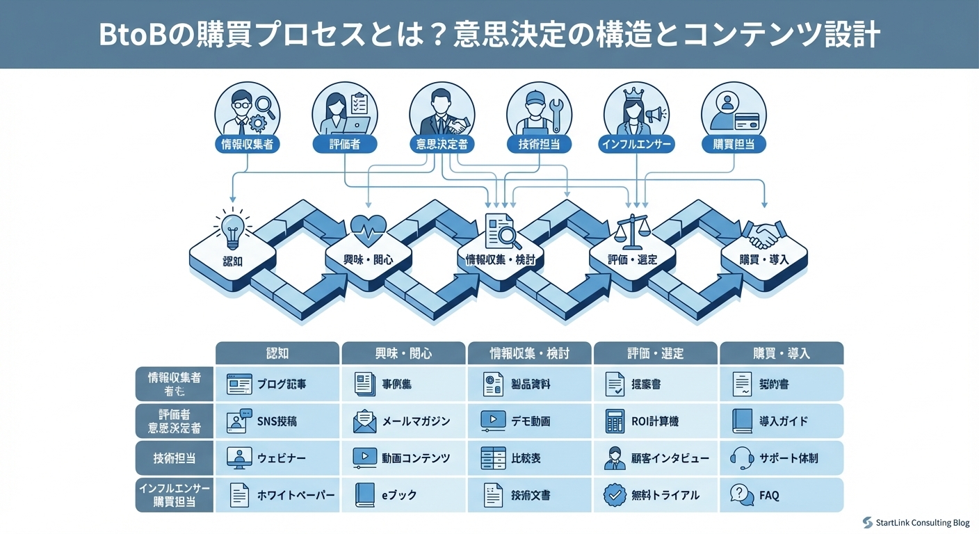 BtoBの購買は、個人の衝動買いとはまったく異なるプロセスで進みます。複数の関与者が、それぞれ異なる視点と基準で評価し、合議で意思決定を行うのがBtoBの特徴です。この構造を理解せずにマーケティングを行うと、「担当者には刺さるが決裁者に刺さらない」「比較検討段階で競合に負ける」といった問題が繰り返し発生します。