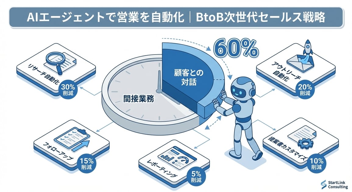 調査によると、BtoB営業担当者が実際に顧客と対話している時間は全体の約30%に過ぎず、残りの70%はリサーチ、データ入力、社内調整などの間接業務に費やされています。