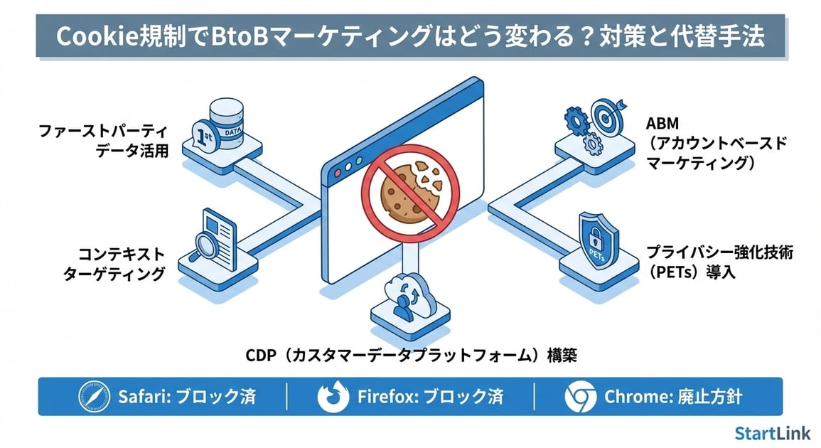 本記事では、Cookie規制の現状整理から、BtoBマーケティングへの具体的な影響、そして5つの対策と代替手法を実践的に解説します。