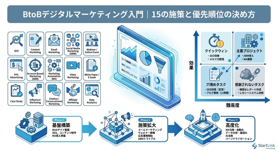 本記事では、BtoBデジタルマーケティングの15の施策を体系的に解説し、自社の状況に合った優先順位の付け方と、段階的な導入ロードマップを紹介します。