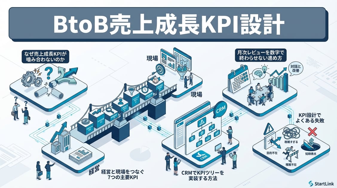 本記事では、BtoB企業が売上成長を管理するためのKPI設計を、経営・営業・マーケティング・カスタマーサクセスを横断する形で整理します。