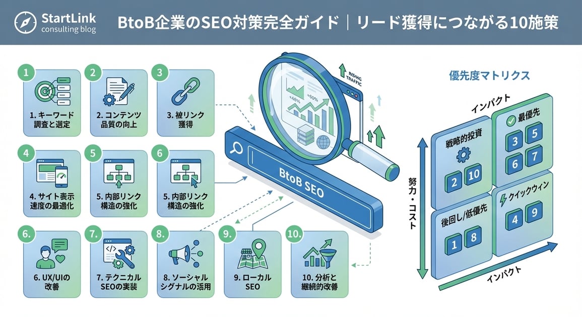 本記事では、BtoB企業がSEOを通じて確実にリードを獲得するための10の施策を、戦略設計・コンテンツ・技術SEO・被リンクの4領域に分けて解説します。各施策は優先度と難易度を明記しており、自社のリソースに合わせて実行計画を立てやすい構成です。