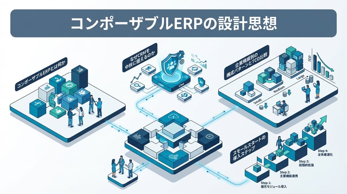 この記事では、コンポーザブルERPの設計思想を中小企業の実務に落とし込み、CRMを中核とした具体的な構成パターンと導入ステップを解説します。