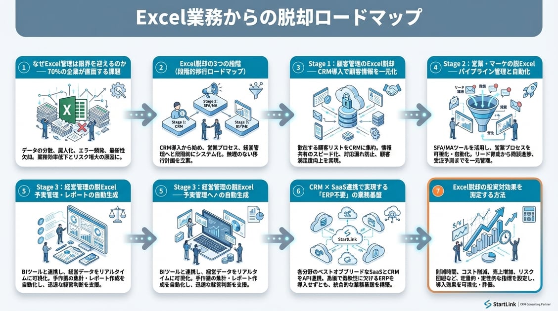 Excel業務からの脱却ロードマップを実務に落とし込むには、CRMツールの活用が不可欠です。詳しくは「CRM導入の進め方完全ガイド|準備・ツール選定・データ移行・定着化の全ステップ」で解説しています。