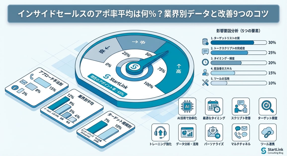 この記事では、業界別・手法別のアポ率データを公開し、アポ率を改善するための9つの具体的な施策と、データ分析による改善サイクルの回し方を解説します。