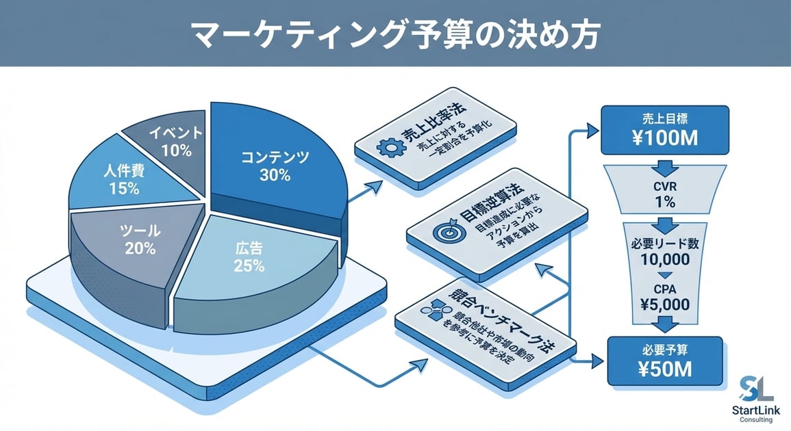 - マーケティング予算を決める3つの手法(売上比率法、目標逆算法、競合ベンチマーク法)