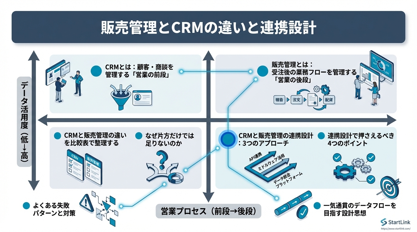CRMと販売管理の連携を設計する際に意識すべきは、「個別システムの最適化」ではなく、「営業プロセス全体の一気通貫」です。