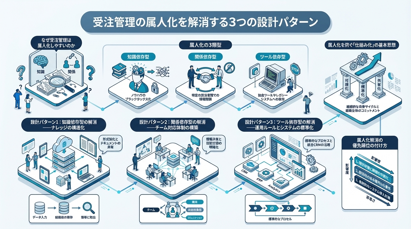 受注管理の属人化が起きる構造的な原因。属人化の3類型(知識依存型・関係依存型・ツール依存型)の見分け方。