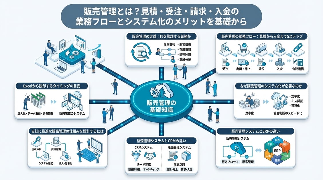 この記事では、販売管理の定義から業務フローの全体像、システム化のメリットと限界、ERP・CRMとの違い、そして自社に合った仕組みの選び方まで、基礎から丁寧に解説します。