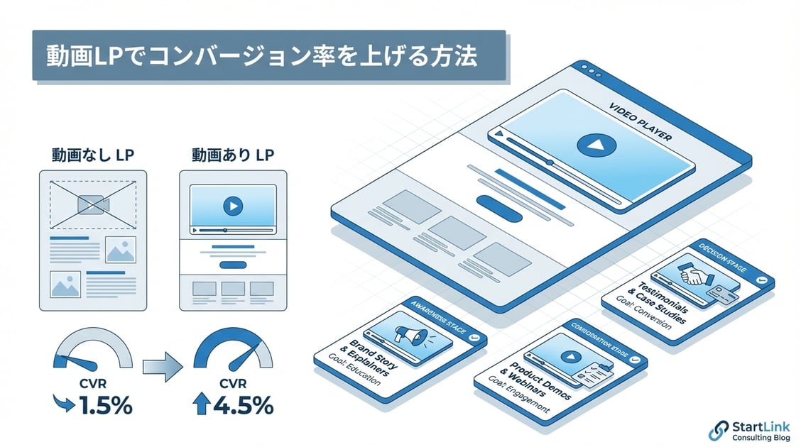 しかし、「動画をただ置けばいい」というわけではありません。動画の種類、長さ、配置場所、自動再生の有無によってCVRへの影響は大きく異なります。適切に設計された動画LPと、そうでないものでは、成果に数倍の差が生まれます。