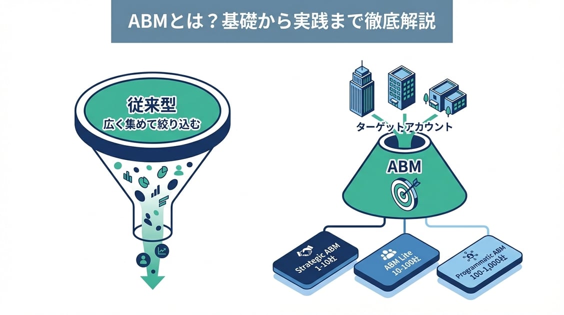 ABM(Account Based Marketing:アカウントベースドマーケティング)は、特定のターゲット企業(アカウント)を選定し、その企業に最適化されたマーケティング・営業活動を展開する戦略手法です。「数多くのリードを獲得してから絞り込む」従来のファネル型マーケティングとは逆に、「最初から狙うべき企業を決めて集中的にアプローチする」という発想で、BtoBマーケティングの潮流を大きく変えています。
