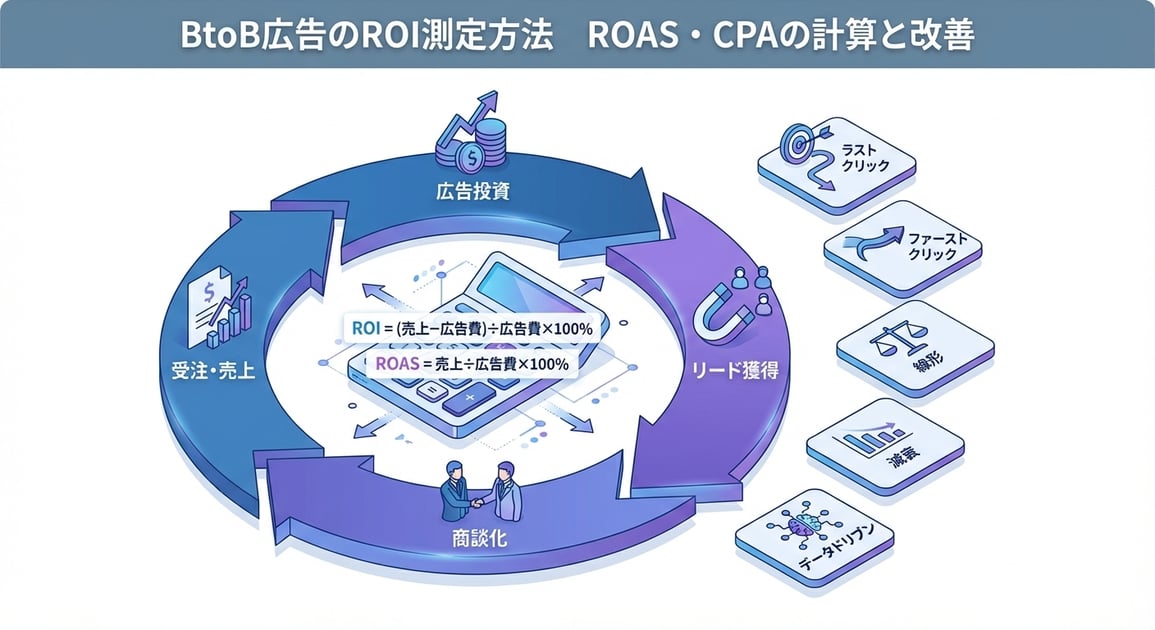 本記事では、BtoB広告のROI・ROAS・CPAの定義と計算式を整理した上で、BtoB特有のアトリビューション課題とその解決策、そして改善の実践フレームワークを解説します。