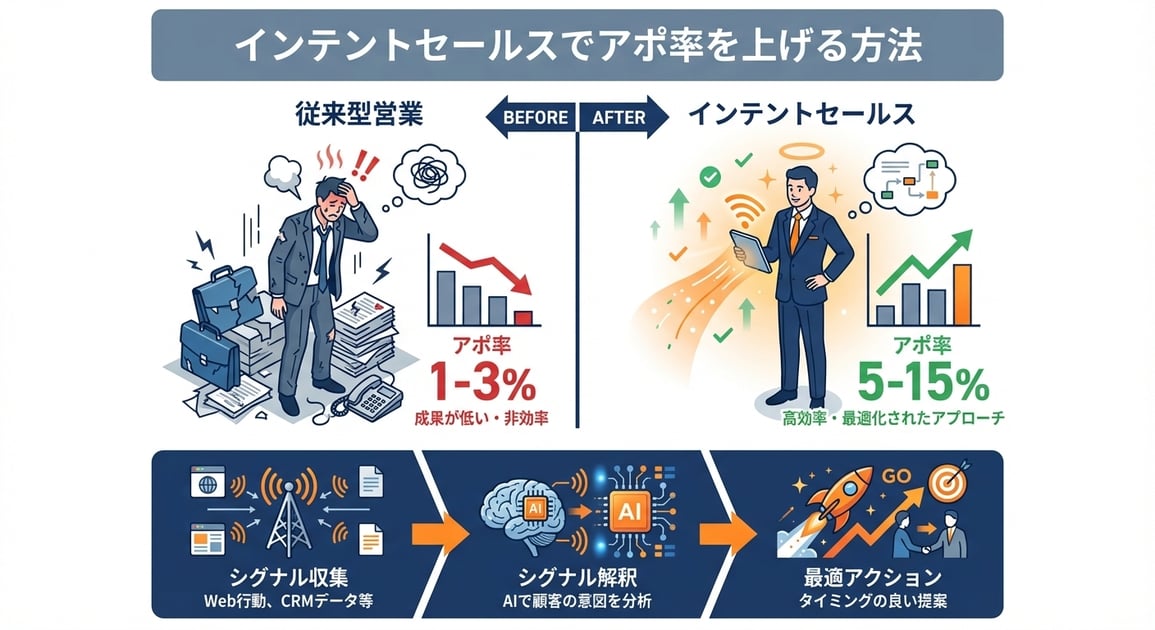 この課題を解決するのが「インテントセールス」です。インテントセールスとは、見込み客の購買意図(インテント)をデータで検知し、最適なタイミングで、最適な相手に、最適なメッセージを届ける営業手法です。「今まさに自社の製品カテゴリに関心を持っている企業」にアプローチするため、従来の闇雲な営業活動と比較して、アポ率・商談化率が大幅に向上します。