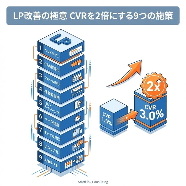 本記事では、LP改善に即効性のある9つの施策を、優先度の高い順に解説します。それぞれの施策について、なぜ効果があるのか(原理)、どう実装するのか(具体的手順)、どれくらい効果が見込めるのか(期待効果)の3点を明確にしています。