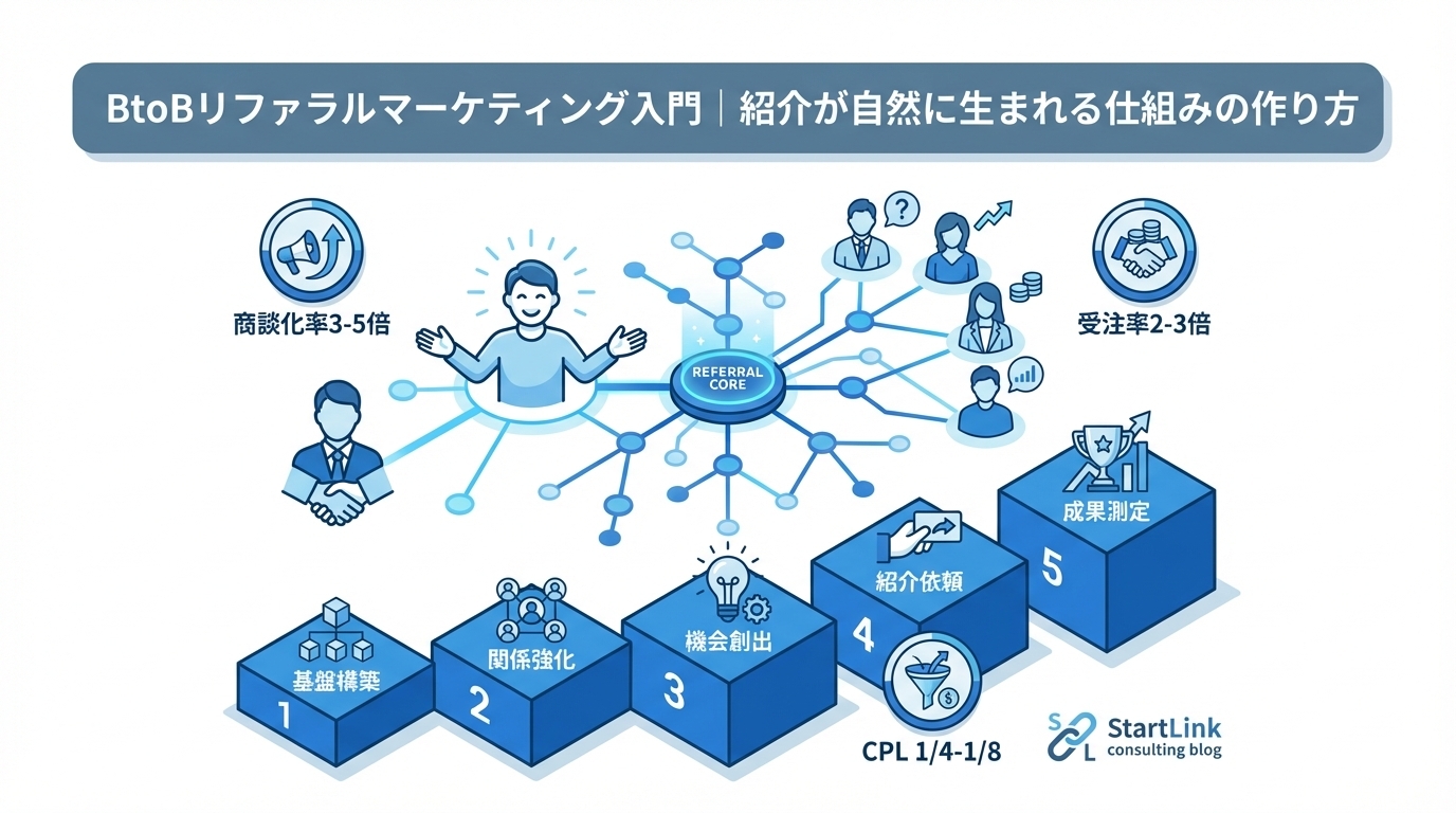 リファラルマーケティングは、BtoBにおいて最もROIの高いリード獲得手法です。しかし、偶然の紹介に頼るのではなく、仕組みとして設計・運用することが成果を最大化する鍵です。