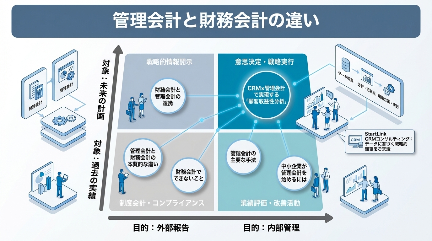metaDescription: "管理会計と財務会計の違いを経営者向けにわかりやすく解説。目的・対象・基準の違い、中小企業が両方を活用するメリット、管理会計の始め方まで実務的に紹介します。"