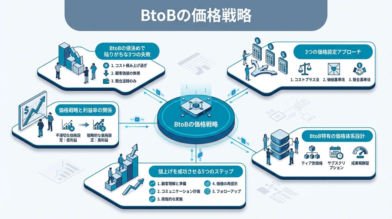 BtoBの価格戦略は、コスト・バリュー・競合の3つのアプローチを組み合わせ、ティアド価格やバンドルなど自社に適した価格体系を設計することで、粗利率と顧客満足の両方を向上させることができます。