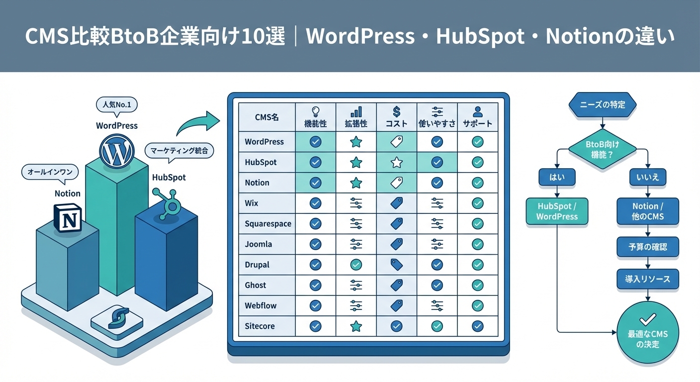 BtoB企業のCMS選定は、単に「使いやすさ」や「費用」だけでなく、マーケティング目的との整合性、社内リソース、総所有コスト、拡張性を総合的に判断することが重要です。
