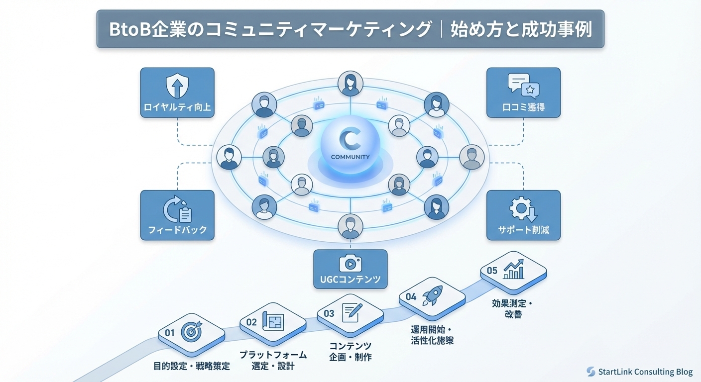 本記事では、BtoB企業におけるコミュニティマーケティングの定義、メリット、コミュニティ設計の5ステップ、運営ノウハウ、KPI設計までを実践的に解説します。