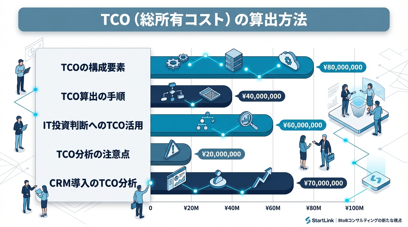 metaDescription: "TCO(総所有コスト)の算出方法とIT投資判断への活用を解説。TCOの構成要素、SaaS vs オンプレミスの比較、CRM導入のTCO分析まで実務的に紹介します。"